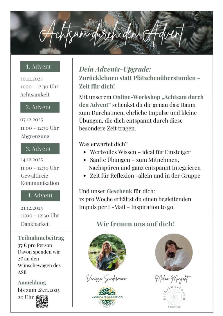 Melina Mingolet von Selbstwertraum und ich werden Euch mit unserem Online-Workshop ruhig und entspannt durch die Adventszeit begleiten. Zeit für dich, statt Plätzchenüberstunden!
